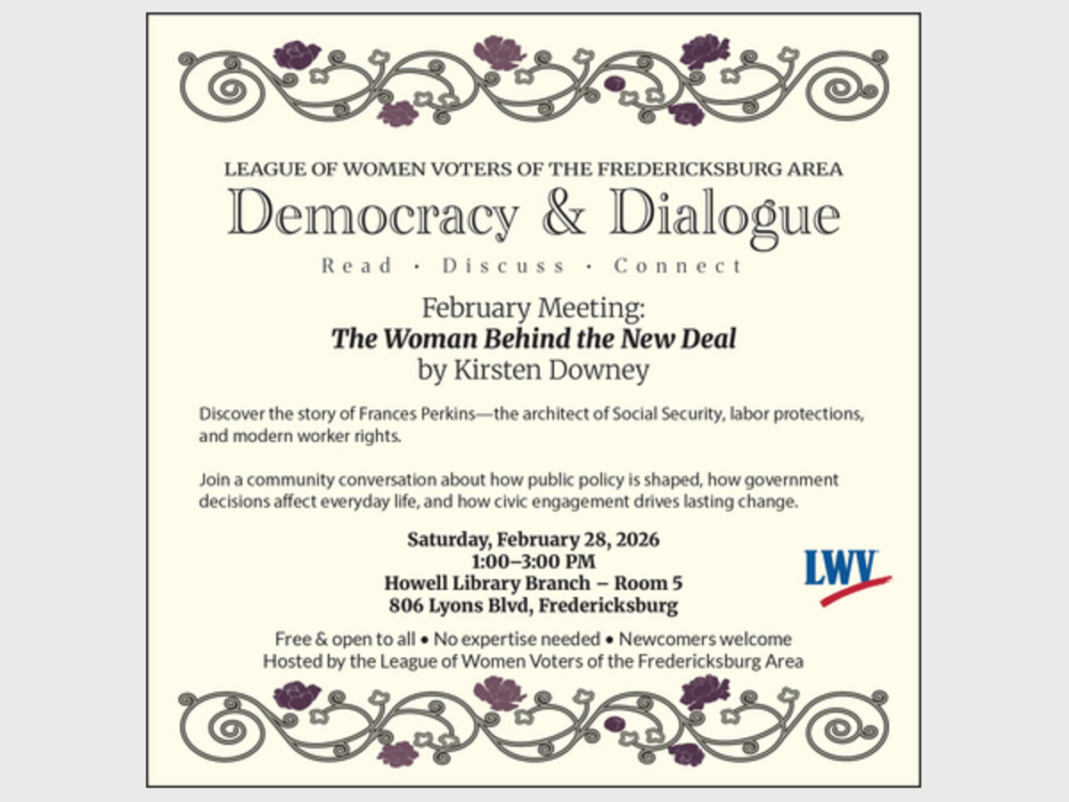 LEAGUE OF WOMEN VOTERS OF THE FREDERICKSBURG AREADemocracy & DialogueRead • Discuss • ConnectFebruary Meeting: The Woman Behind the New Dealby Kirsten Downey Discover the story of Frances Perkins-the architect of Social Security, labor protections,and modern worker rights. Join a community conversation about how public policy is shaped, how governmentdecisions affect everyday life, and how civic engagement drives lasting change. Saturday, February 28, 20261:00-3:00 PMHowell Library Branch - Room 5806 Lyons Blvd, FredericksburgFree & open to all • No expertise needed • Newcomers welcome