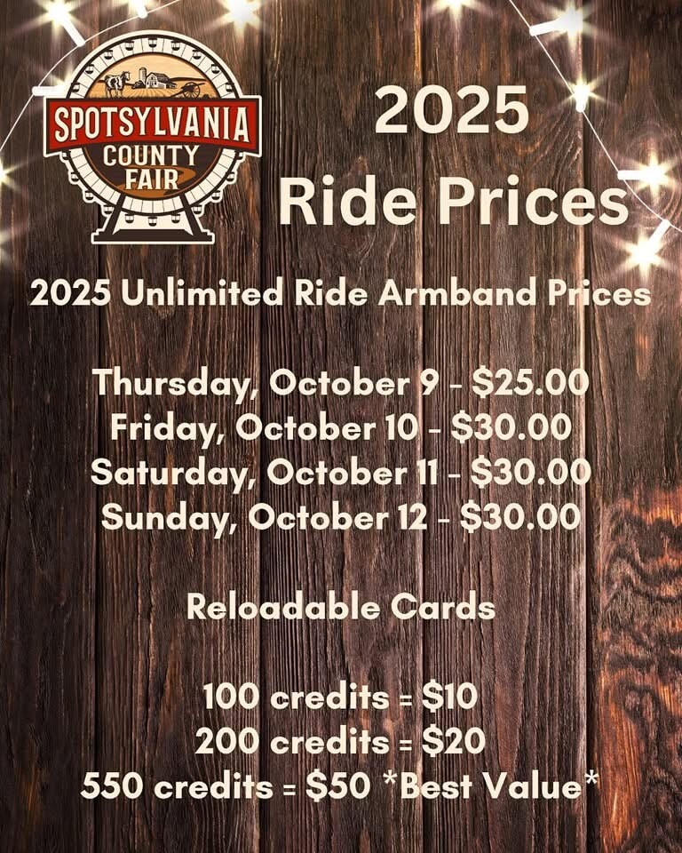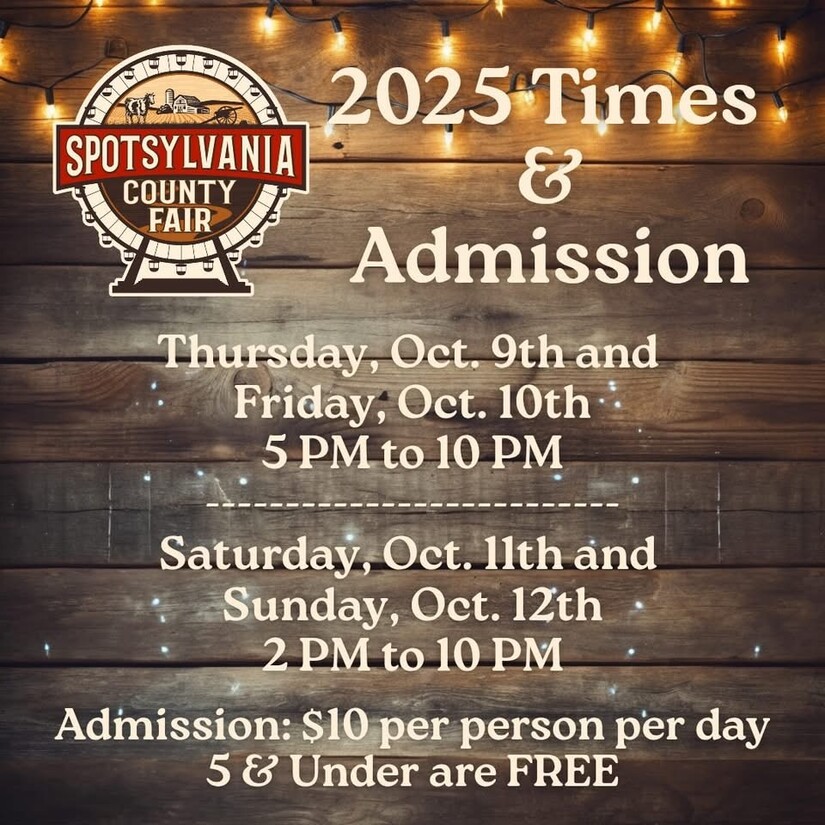 The Spotsylvania County Fair starts tomorrow and ends on Sunday! This will be the first County Fair for Spotsylvania. Fun, rides, Fair Food, etc. There will be a Miss Spotsy Pageant Contest, Musical acts, and a petting zoo. Idea for Children and Families alike.