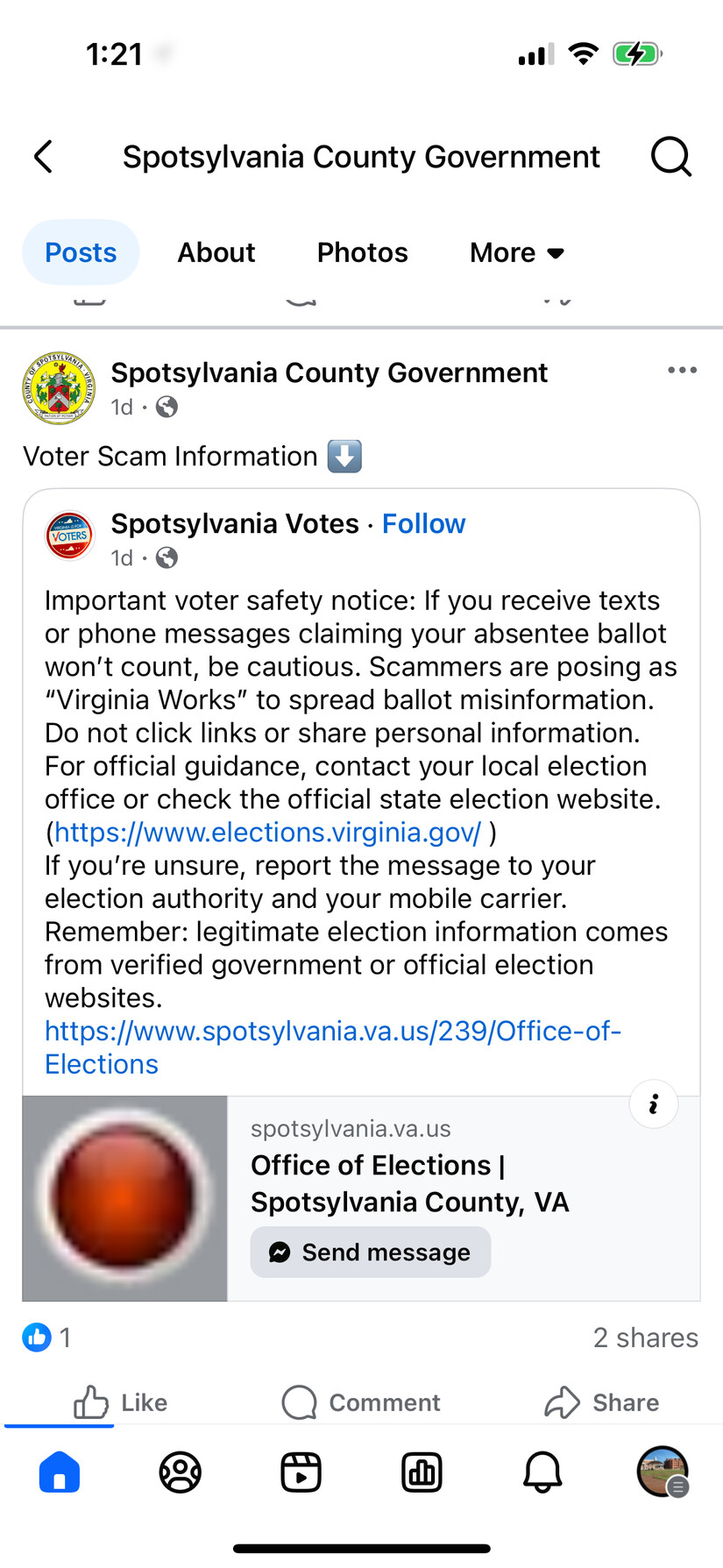From the Spotsylvania Board of Elections: Look for Scammers over the Phone or Texts concerning Absentee Ballots