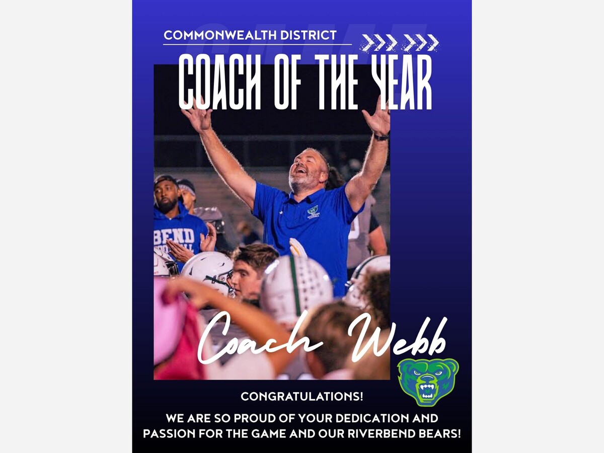 For the First Time in School history Riverbend High School Football Coach Webb wins District Coach honors. The Team goes 10-0 and will play Friday night at Riverbend against Portmac Falls at 7:00 pm in the VHSL Class 5 Playoffs.