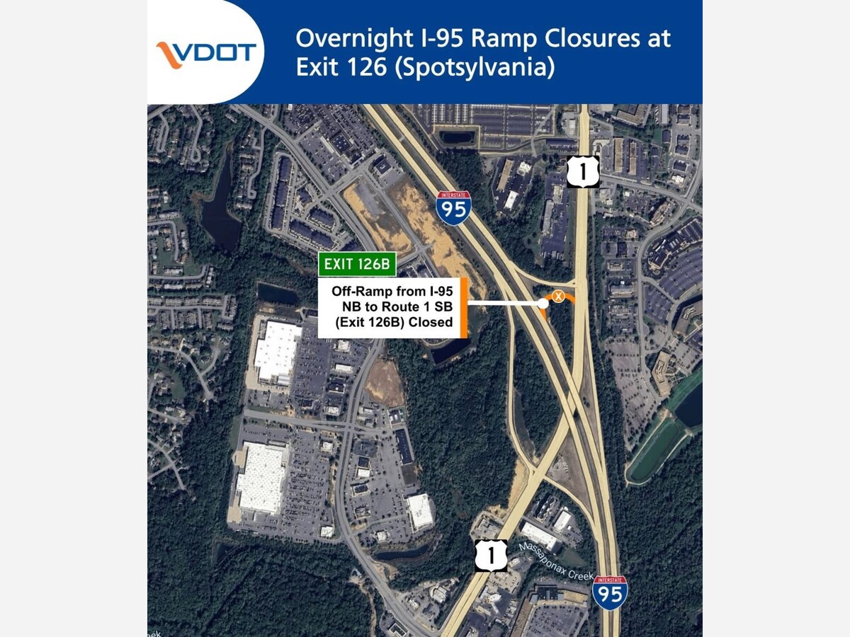 Overnight I-95 ramp closures at Exit 126B (Spotsylvania) planned for next week. Starting Monday, 3/9 through early Friday, 3/13, I-95 northbound off-ramp to Rt. 1 southbound will be closed for construction. More https://bit.ly/4ssVbQy